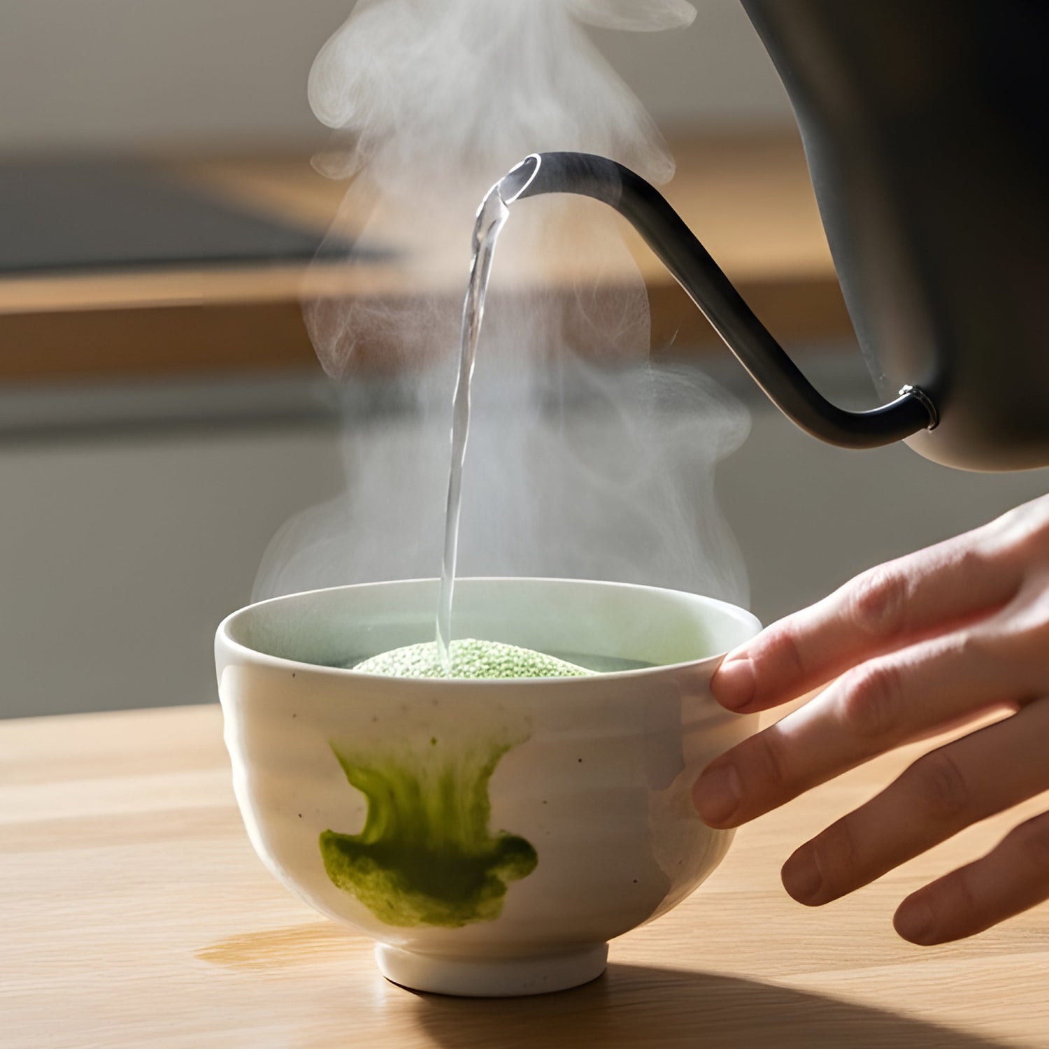 Matcha-Schale. Übergieße das Matcha-Pulver mit 100 ml heißem, nicht mehr kochendem Wasser (etwa 70–80 °C) und lasse es einige Sekunden ziehen, damit sich den Geschmack des Matchas voll entfalten können.